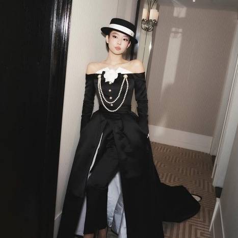 제니가 착용한 의상은 샤넬의 오뜨 꾸뛰르 작품이라고 해요. 무려 330시간이나 걸쳐서 완성했다는데… 퀄리티 진짜 미쳤다리… ✨ 전체적으로 클래식한 샤넬 무드를 현대적으로 재해석한 스타일인데, 오프숄더 실루엣에 풍성한 롱 트레인 스커트, 블랙 슬림 팬츠 레이어드까지… 드레스와 수트를 믹스매치한 센스가 돋보였어요. 👍