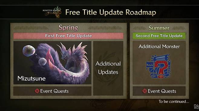 봄에 진행되는 첫 번째 무료 타이틀 업데이트의 주인공은 몬스터 헌터 크로스에서 첫 등장한 이후, 최근 몬스터 헌터 라이즈에서도 모습을 보였던 '포호룡 타마미츠네'가 그 주인공. 이와 함께 이벤트 퀘스트와 몇몇 추가 업데이트가 봄 중 이뤄질 예정이며, 여름에 진행되는 두 번째 무료 타이틀 업데이트 또한 자세한 정보는 공개되지 않았지만 신규 대형 몬스터가 등장할 예정이다.