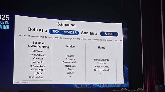 이번 행사에서 '휴머노이드 로봇의 황금기'를 주제로 발표에 나선 오 단장은 "삼성은 테크 프로바이더(기술의 공급자)이자 사용자 역할을 동시에 수행하는 이상적인 생태계를 가지고 있다"며 "모바일, 가전, 화학, 건설, 제약, 반도체, 물류 조선업, 금융, 관광·여가, 헬스케어 등 거의 모든 영역을 포괄하고 있다"고 설명했다.