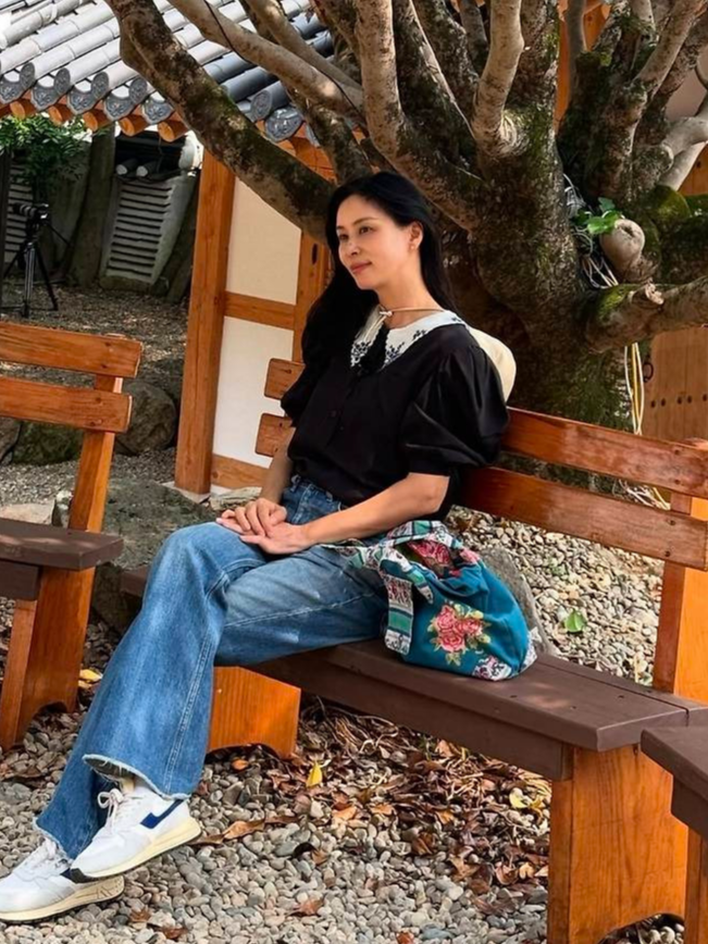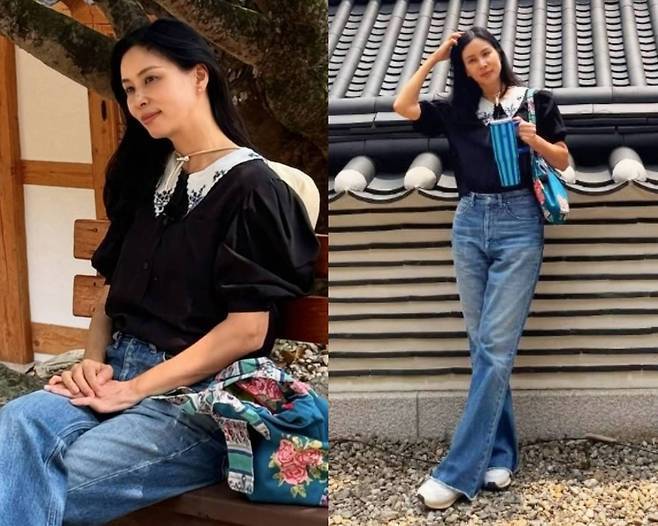 넉넉한 핏의 중청 플레어 데님에 자수 포인트가 살아있는 블랙 블라우스를 매치해 앤틱 한 분위기를 자아냈고, 흰색 운동화와 패턴 토트백으로 편안하면서도 개성 넘치는 룩을 완성했습니다.