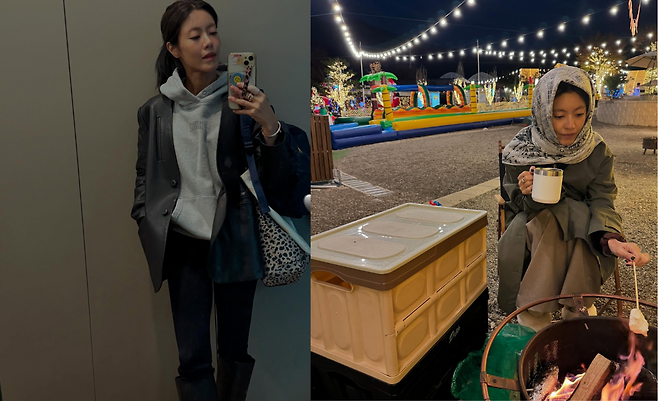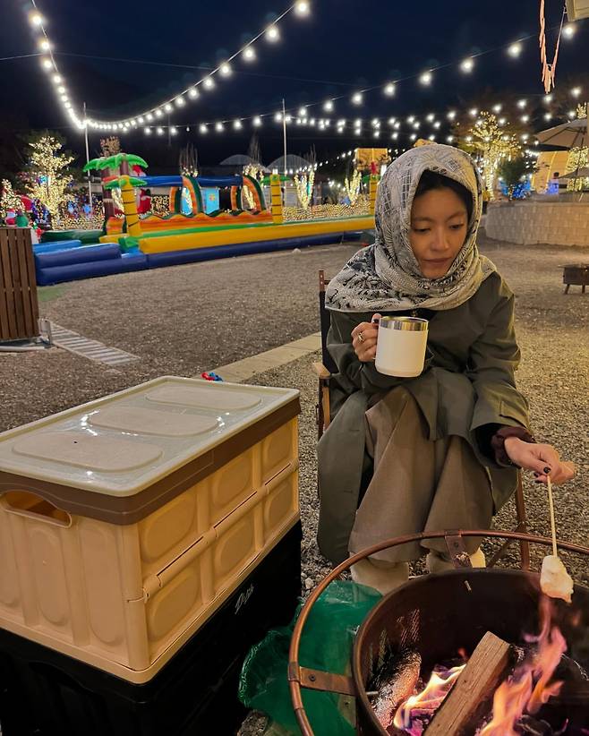 배우 이윤지가 겨울 캠핑장에서 따뜻한 감성을 연출하고 있다. 올리브 그린 코트에 회색 스카프를 두른 그녀는 실용적이면서도 세련된 겨울 캠핑 룩을 선보이고 있다. 손에는 따뜻한 음료가 담긴 머그컵을 들고, 모닥불 앞에서 마시멜로를 구워 여유로운 캠핑 분위기를 자아내고 있다. 배경에는 화려한 조명과 에어바운스가 보이는 가운데, 이윤지는 편안하면서도 스타일리시한 아웃도어 패션으로 겨울 캠핑의 로맨틱한 분위기를 완성하고 있다.