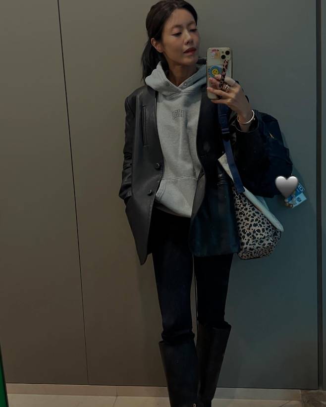 배우 이윤지가 모던한 블랙 가죽 재킷을 활용한 세련된 스타일을 선보이고 있다. 그레이 후드티와 블랙 팬츠를 매치해 캐주얼하면서도 도시적인 감각을 연출하고 있다. 특히 가죽 재킷의 구조적인 실루엣이 이윤지의 세련된 이미지를 한층 더 부각시키고 있으며, 레오파드 패턴의 가방을 포인트 아이템으로 활용해 전체적인 스타일에 생동감을 더하고 있다. 블랙 롱부츠로 마무리한 이 룩은 도시 여성의 실용적이면서도 트렌디한 겨울 스타일링의 좋은 예시를 보여주고 있다.