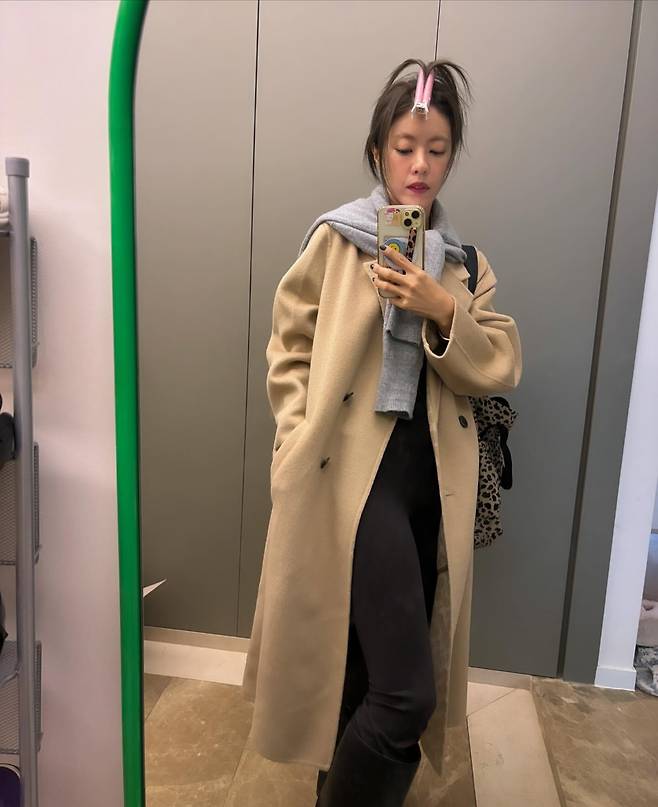 이윤지가 미니멀한 베이지 롱코트로 세련된 겨울 패션을 선보이고 있다. 그레이 머플러를 자연스럽게 두른 그녀는 블랙 팬츠와의 컬러 대비로 깔끔한 모노톤 룩을 완성했다. 머리에 핑크색 헤어핀을 포인트로 더해 귀여운 감성을 더했으며, 레오파드 패턴의 가방으로 전체적인 룩에 변화를 주고 있다. 거울 셀카를 통해 캐주얼하면서도 도시적인 분위기를 연출하며, 일상 속 세련된 겨울 패션을 보여주고 있다.