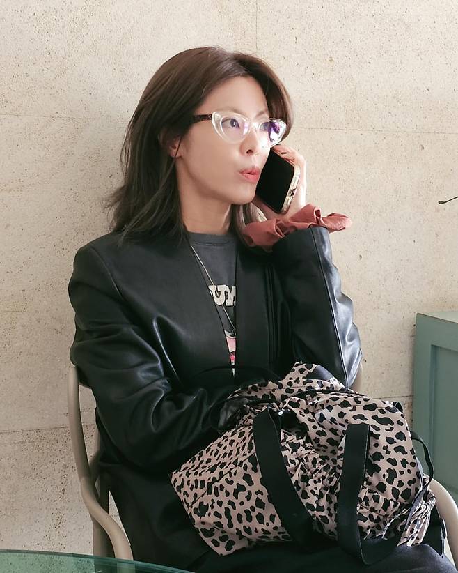 투명 프레임의 안경과 블랙 레더 재킷으로 지적이고 세련된 오피스 룩을 연출하고 있는 이윤지의 모습이다. 그레이 티셔츠를 레이어드한 그녀는 레더 재킷의 강렬함과 부드러운 내추럴 메이크업의 조화로 프로페셔널한 분위기를 자아내고 있다. 특히 레오파드 패턴의 가방을 다시 한번 활용해 자신만의 스타일을 일관되게 유지하면서도 다양한 연출이 가능함을 보여주고 있다. 전화 통화 중인 모습으로 바쁜 일상 속에서도 패션 센스를 놓치지 않는 현대 여성의 모습을 표현하고 있다.