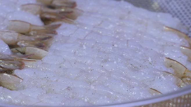 먼저 밑간이 된 새우를 밀가루에 골고루 묻혀 주세요.