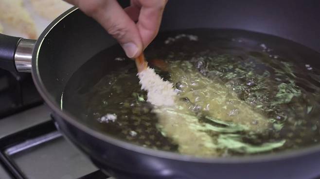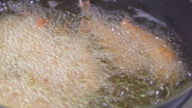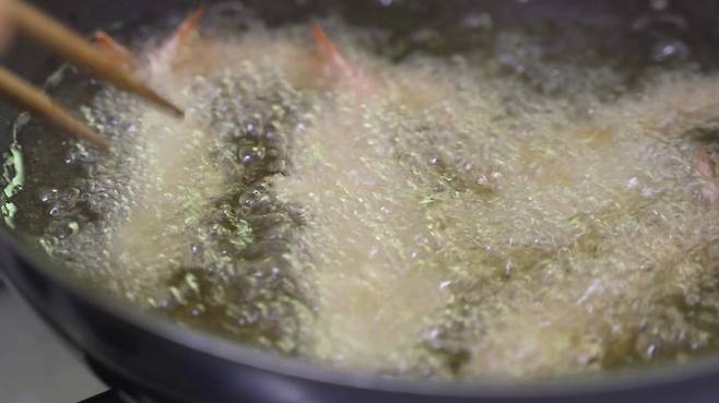 살살 뒤적여 가며 새우를 튀겨 주세요.
