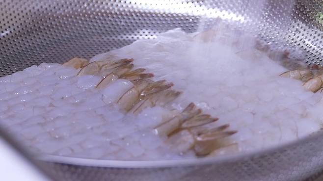 먼저 새우를 채반에 넣고 물로 살짝 한 번만 적셔 주세요. 한번 이렇게 살살 씻은 후