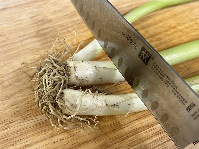 대파 흰대는 냉장보관하여 2주까지도 신선하게 즐길 수 있습니다. 우선 파뿌리를 자릅니다.