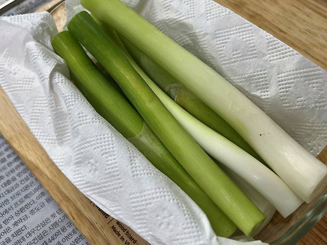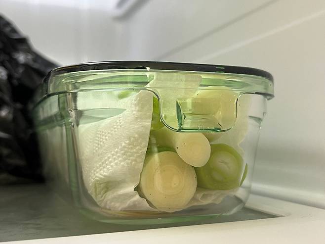 용기에 파를 담은 후 뚜껑을 덮어 냉장고에 보관합니다. 이렇게 하면 키친타월이 수분을 흡수하여 파가 금방 무르지 않습니다.