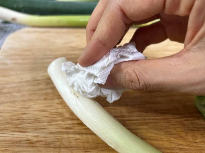 대파는 씻지 않고 겉에 흙 묻은 껍질은 제거한 뒤 키친타월로 닦아 정리합니다.