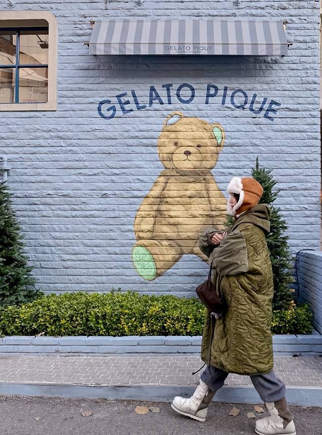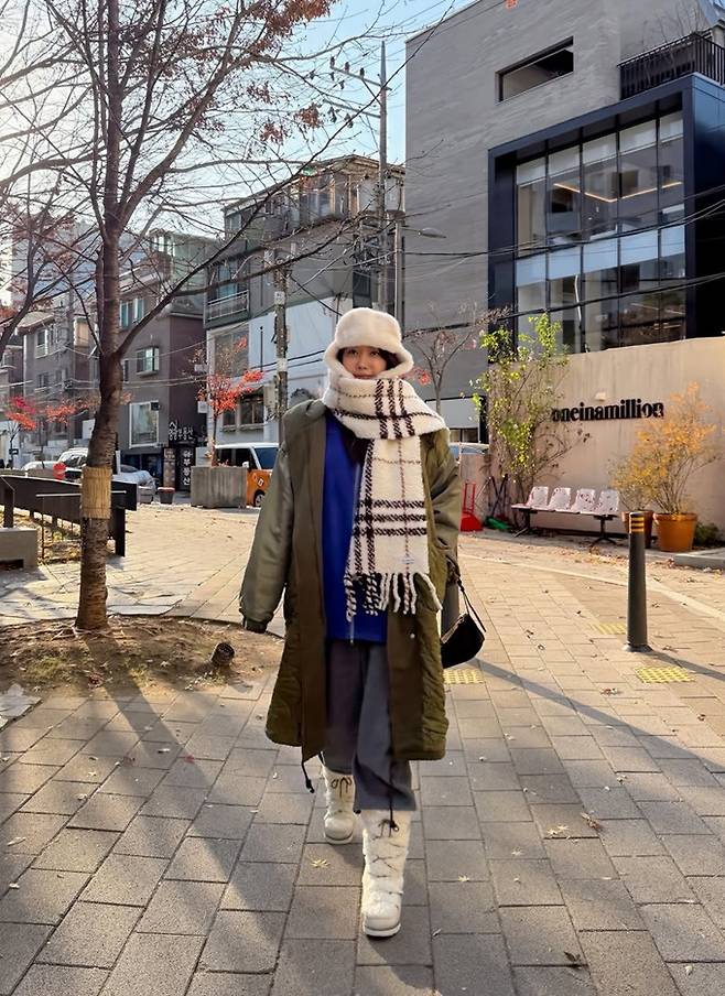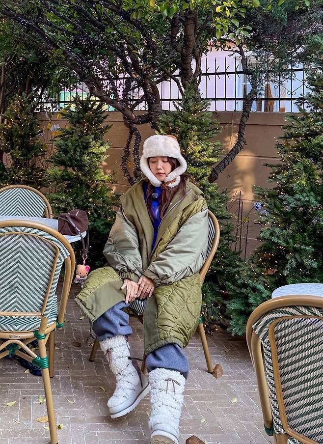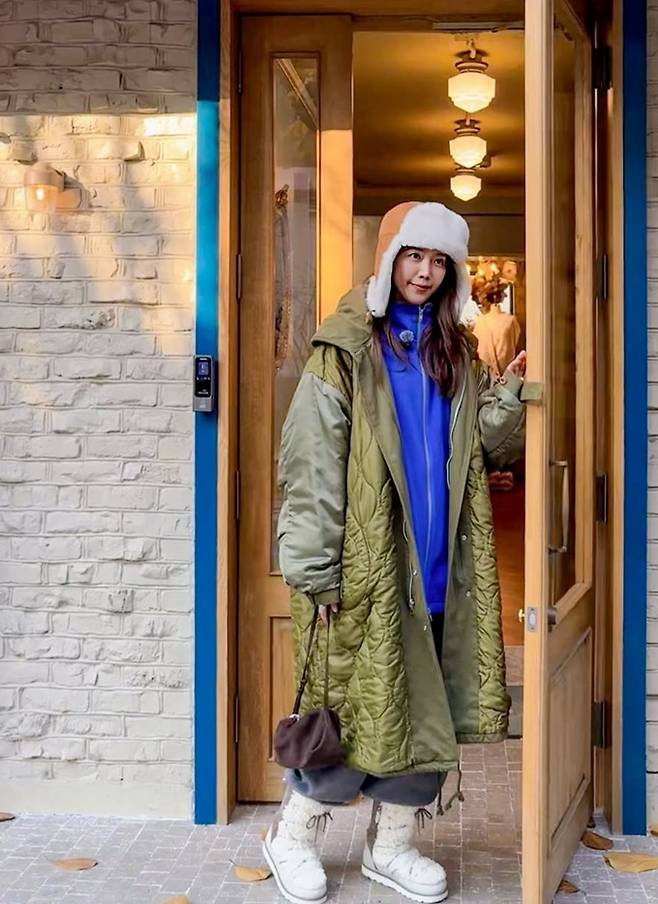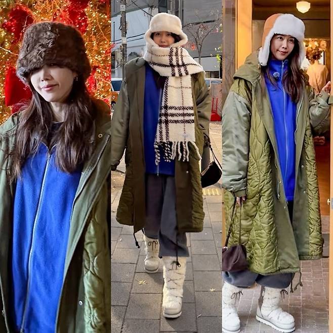 채정안은 겨울 조거팬츠와 집업 뽀글이 재킷에 패딩 롱 코트를 입고, 여기에 퍼 샤프카 햇과 바라클라바를 매치한 윈터룩을 완성했다.