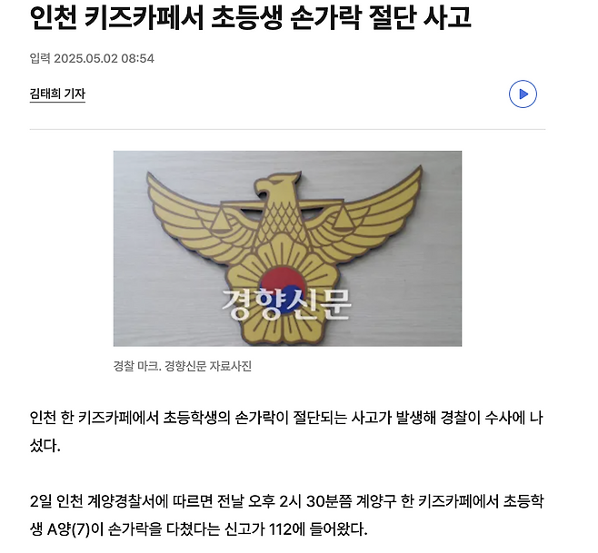인천 키즈카페서 초등생 손가락 절단 사고