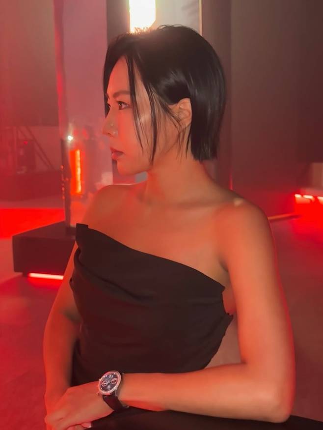 여기에 짧은 보브컷과 미니멀한 블랙 워치, 그리고 군더더기 없는 누드 톤 메이크업이 더해져 전체 룩의 완성도를 높였다.