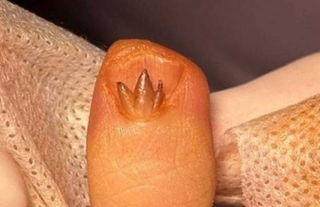 네일아트를 즐기던 그녀는 실제로 손톱 위에 로고 모양처럼 붉은 돌기가 자라 병원을 찾았다고 합니다.