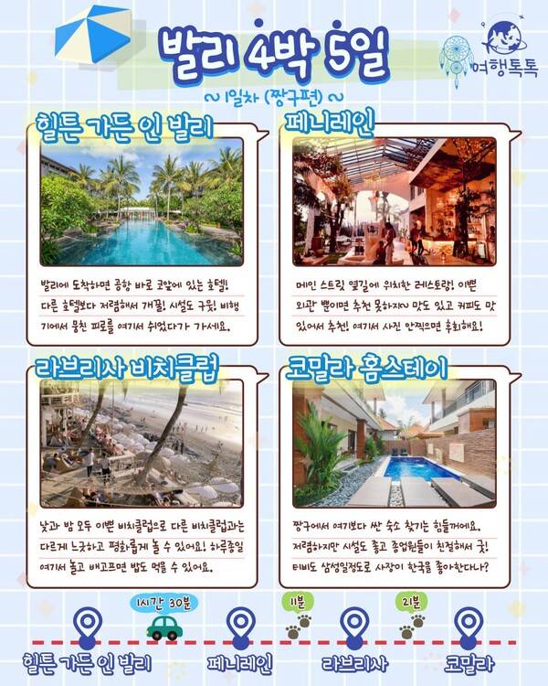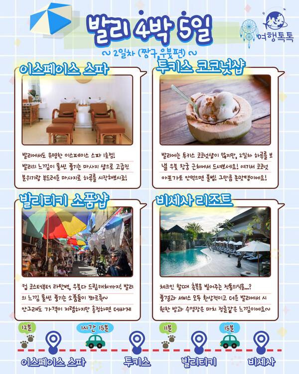 오늘은 발리 자유여행 4박5일 여행코스를 소개해 드리겠습니다! 경비와 장소 간의 이동 시간, 투어 꿀팁 모두 안내드릴테니 발리에 가시기전 꼭 한번쯤 보고가세요~