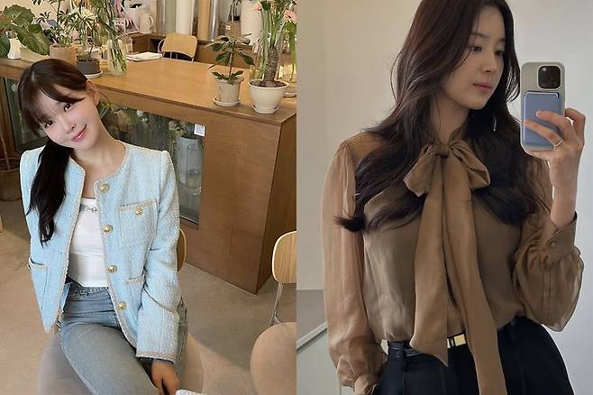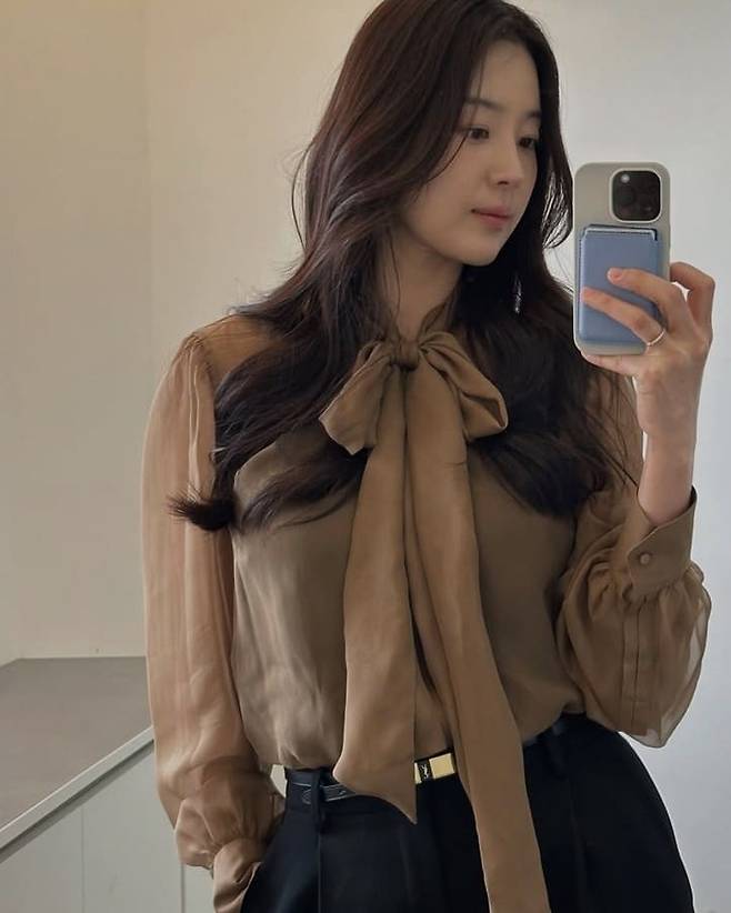 한지혜는 2025년 봄 시즌 트렌드로 주목받는 시스루 블라우스를 선택했다.