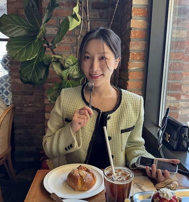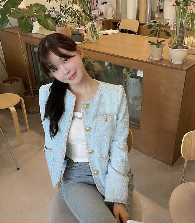 아나운서 김윤희는 하늘색 트위드 재킷을 중심으로 산뜻한 봄 느낌을 살린 하객룩을 선보였다.