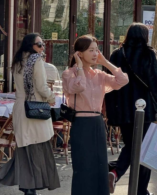 이시영은 은은한 핑크 컬러 셔츠에 그레이 롱스커트를 매치해 고급스럽고 차분한 하객룩을 완성했다.