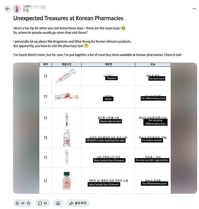 해외 커뮤니티 Reddit에서는 <꼭 사야 할 K-약국 화장품 리스트>까지 떠돌아다니고 있다고 해서 직접 찾아보았습니다! ☺️