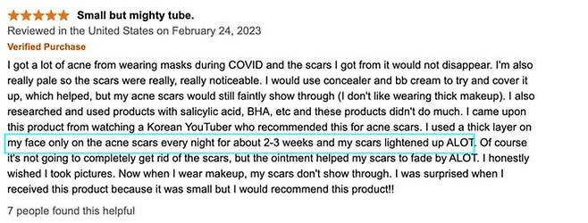 "한국 유튜버 추천으로 사봤는데 매일 밤 2~3주 정도 바르니 많이 옅어졌다."