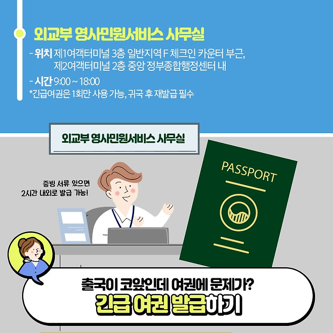 출국이 코앞인데 여권을 놓고왔거나, 문제가 있다면 외교부 영사민원서비스 사무실에서 긴급 여권 발급 서비스가 진행중입니다. 오전 9시 ~ 오후 6시 업무 가능하며, 긴급여권의 경우 1회만 사용 가능합니다. 또한, 귀국 후 재발급은 필수이니 참고하시기 바랍니다.
