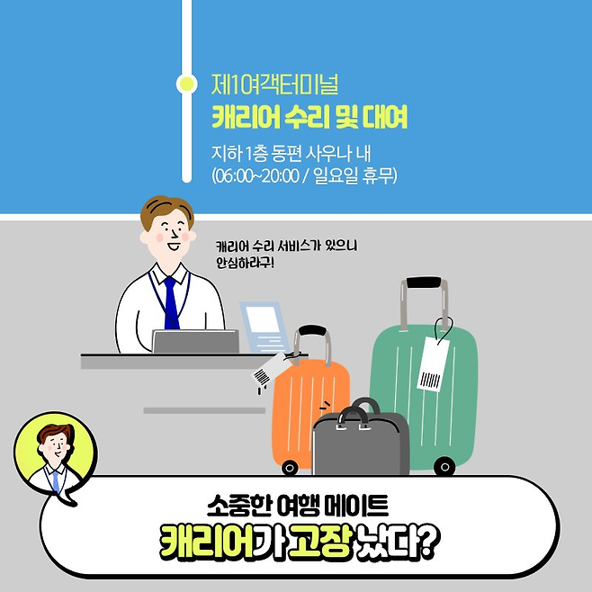 만약, 공항 도착 후 캐리어가 고장난 것을 발견했다면? 부담갖지 말고 제1여객터미널 캐리어 수리 및 대여 서비스를 받을 수 있습니다.