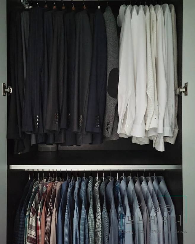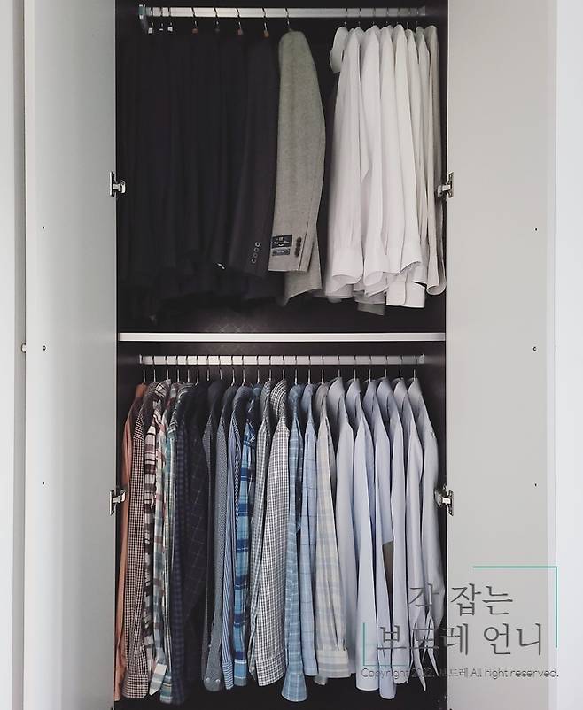 상단에는 양복 상의를 하단에는 셔츠를 수납하고 있어요. 양복은 어두운 컬러부터 밝은 컬러 순으로 정리했어요.