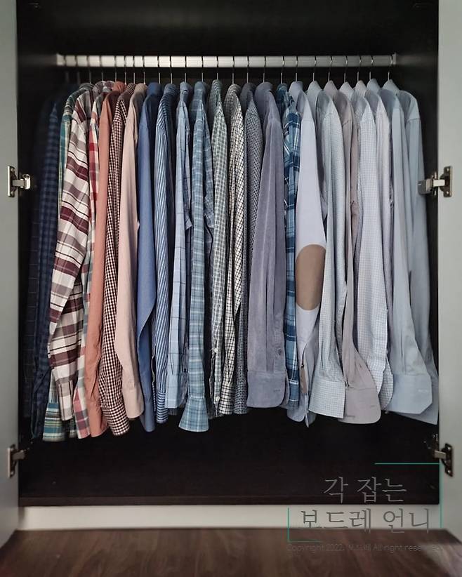 그리고 비슷한 톤끼리 그라데이션 느낌으로 걸어 주세요. 이렇게 걸어 주면 옷장을 열었을 때, 깔끔한 느낌도 들지만 옷을 찾아 입기도 훨씬 수월해진답니다.