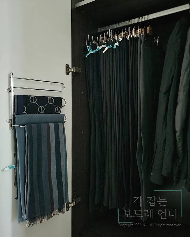 붙박이장에 옵션으로 설치되어 있던 넥타이 걸이인데요. 저는 머플러를 걸어 주었습니다.
