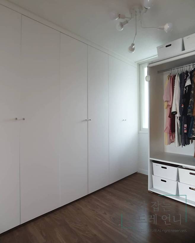 이 방을 드레스룸으로 결정하게 된 이유는 이미 붙박이장이 설치되어 있었기 때문이에요. 철거를 하고 새로 디자인을 할까 고민했지만 좀 낭비인 것 같은 생각이 들어서 그대로 사용하기로 했어요.