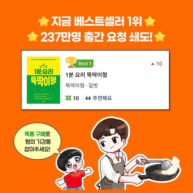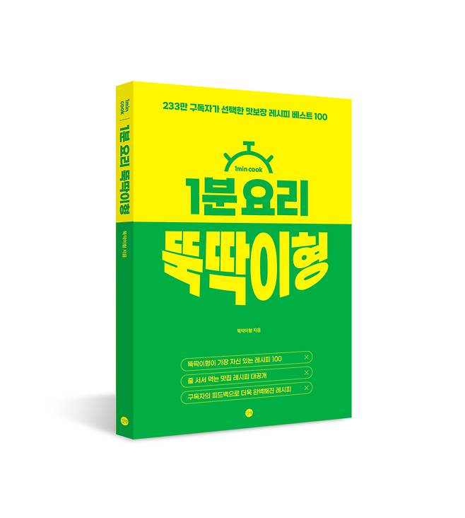 1분 요리 뚝딱이형 영상의 부족한 점을 보완한 '완벽한 레시피'를 담아내기로 마음먹고 여러분들께 사랑받은 100가지 레시피를 엄선하여 연구하고 또 연구했다. 댓글을 남겨주신 여러분들의 수많은 피드백을 수렴하여 요리 초보자들도 실패없이 만들 수 있도록 영상의 레시피를 보완했고, 1분 안에 압축해서 보여주는 나의 영상 컨셉으로 인해 미처 전하지 못했던 세세한 요리 꿀팁들도 책에 담고자 했다. 구독자분들이 보기에도 편한 요리책으로 만들기 위해 직접 하나씩 재촬영을 진행한 끝에 지금의 <1분 요리 뚝딱이형>요리책이 탄생하게 되었다.
