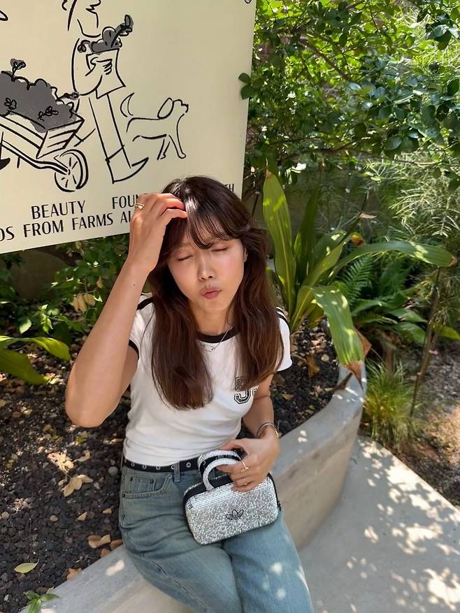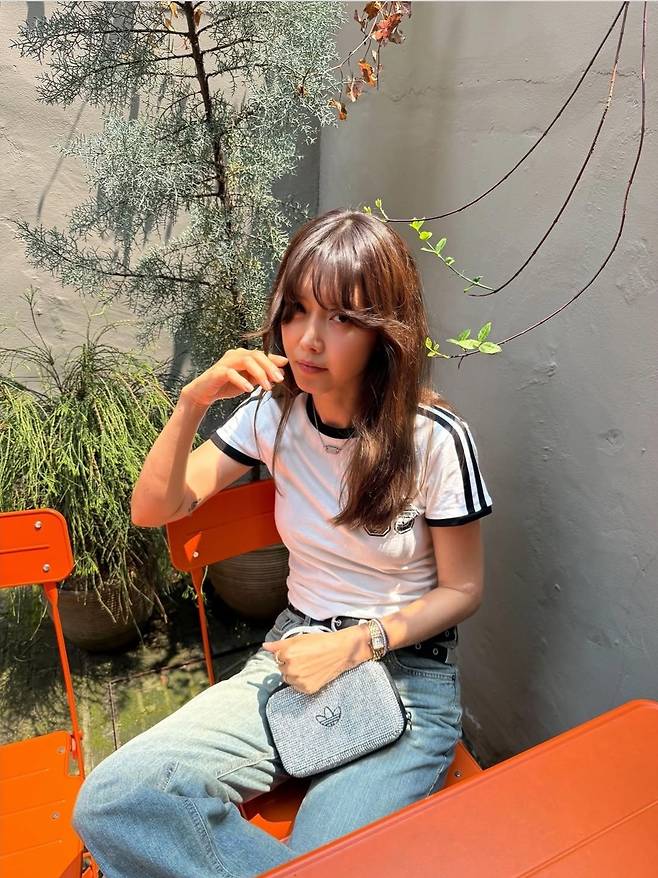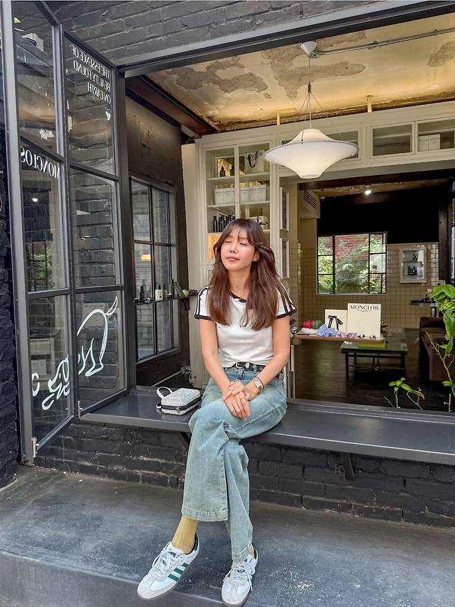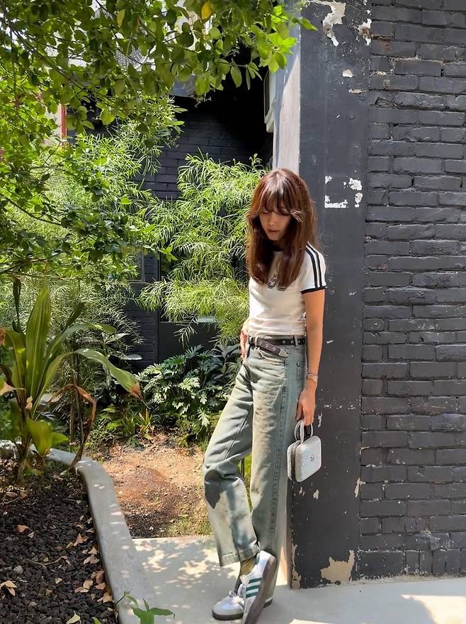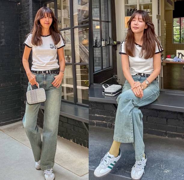 흰색 배색 라인 반팔 티셔츠에 워싱이 강하게 들어간 와이드 데님 팬츠를 매치한 채정안은, 클래식하고 빈티지한 무드의 스트리트룩을 완성했습니다.