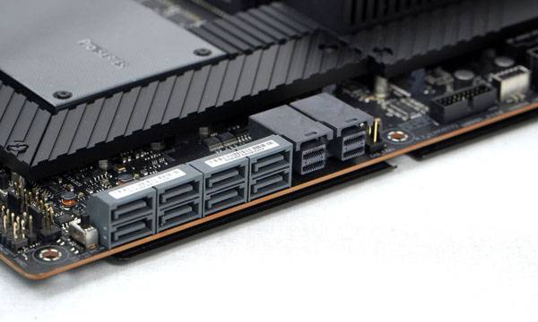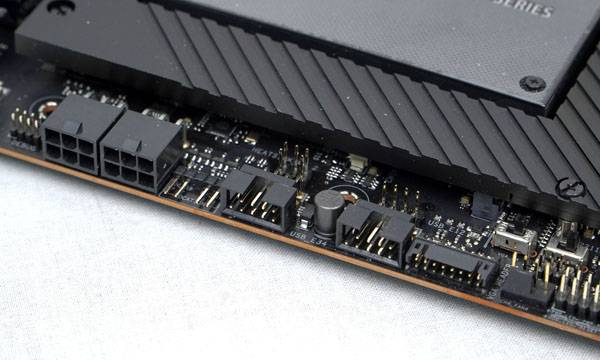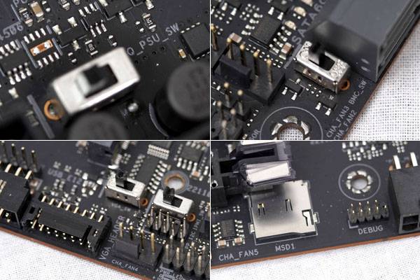 메인보드 하단에는 각종 커넥터가 일렬로 배치되어 필요한 장치를 빠르게 연결하고 더 갈끔한 라우팅, 더 쉬운 관리를 위한 능률적인 설치 작업을 가능하게 만든다. 일반 데스크탑 메인보드에서 볼 수 없는 서버/워크스테이션 환경을 위한 통합 BMC(Baseboard Management Controller) 관련 스위치 및 각종 커넥터도 제공된다.