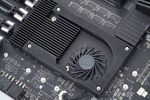 뜨거워진 바람을 사방에 퍼뜨리는 일반 칩셋 쿨러 방식이 아닌 그래픽 카드 쿨러처럼 배기 경로에 표면적을 최대화시킨 방열핀을 배치해 효율성을 높였는데, 이는 WRX80 메인보드 칩셋 뿐만 아니라 ASPEED AST2500 고급 PCIe 그래픽 및 원격 관리 프로세서 쿨링까지 동시에 담당하기 때문이다.