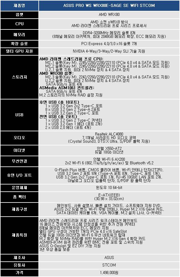 ASUS PRO WS WRX80E-SAGE SE WIFI STCOM은 AMD 라이젠 스레드리퍼 프로 5000 WX 시리즈를 지원하기 위해 만든 sWRX8 소켓 방식의 워크스테이션 메인보드다.