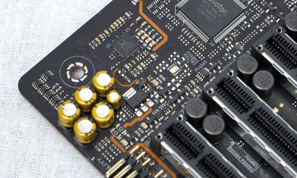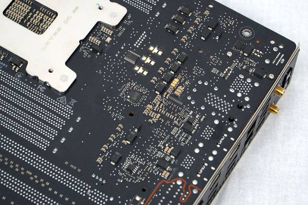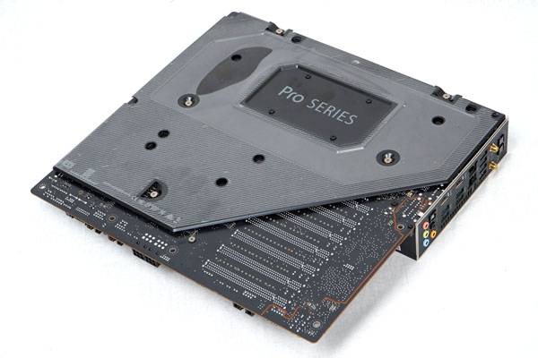 메인보드 후면을 거의 덮어버리는 메탈릭 블랙 알루미늄 돌출부와 스테인리스 스틸 블랙 메시 커버는 깔끔하고 세련된 디자인을 완성하는 동시에 고사양 그래픽 카드나 무거운 CPU 쿨링 솔루션 등을 장착해도 메인보드가 휘어지지 않도록 유지하면서 후면부까지 배치된 일부 컴포넌트들이 시스템 조립시 케이스에 닿는 것을 방지하는 역할도 맡는다.