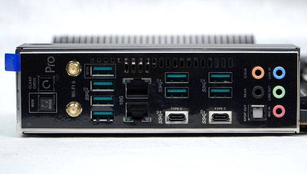 후면 I/O 구성은 CPU나 메모리가 없어도 손쉽게 메인보드 바이오스를 업데이트 할 수 있는 BIOS 플래시백 버튼과 CMOS 클리어 버튼, 인텔 WiFi6 AX200 무선 네트워크 기능을 사용하기 위한 2개의 무선 안테나 단자, 9개의 USB 3.2 Gen 2 포트(Type-A 8개 및 Type-C 1개), USB 3.2 Gen 2x2 Type-C 포트, 듀얼 10Gbps 이더넷 포트, 5개의 오디오 잭과 S/PDIF 광 출력 단자로 구성된다.