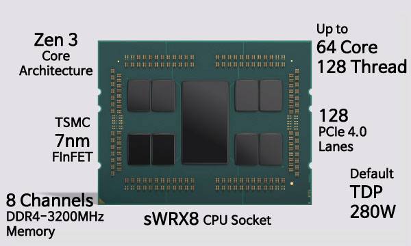 sWRX8 CPU 소켓은 데스크탑용 라이젠 5000 시리즈에 들어간 Zen3 아키텍처를 기반으로 통합 8코어 CCX(Core Complex) 구조로 만들어진 라이젠 스레드리퍼 프로 5000 WX 시리즈를 지원한다. 기본 TDP는 라이젠 스레드리퍼 3000 시리즈와 동일한 280W에 코어 수 증가에 따라 베이스 클럭을 낮춰 발열을 제어한다.