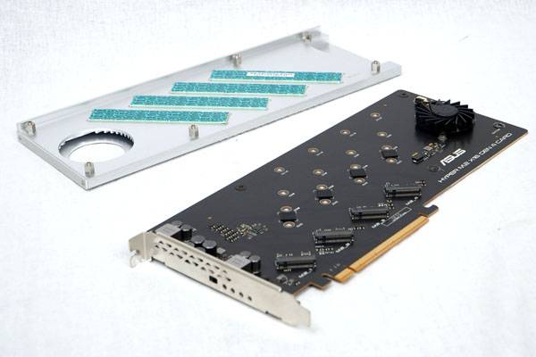 메인보드에 풍부하게 달린 PCIe 4.0 x16 슬롯 가운데 하나를 사용하여 최대 4개의 PCIe 3.0 x4 M.2 SSD로 일반 PCIe 3.0 NVMe M.2 SSD보다 8배 빠른 처리량을 가진 RAID Array를 구성할 수 있다. 거대한 알루미늄 방열판과 쿨링 팬을 통해 M.2 SSD 발열도 효율적으로 처리 가능하다.