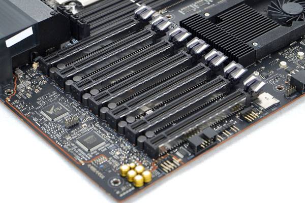 7개의 풀사이즈 PCIe 4.0 x16 슬롯으로 고성능 외장 그래픽 카드나 다양한 PCIe 확장 카드를 장착할 수 있으며, 멀티 GPU 구성을 위한 엔비디아 4-Way/3-Way/2-Way SLI 기술을 지원한다.