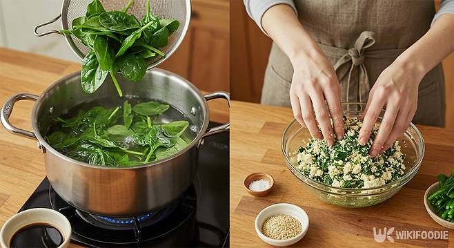 먼저 냄비에 물을 끓여 두부 1/2모를 넣고 데친다.두부는 물기를 잘 빼야 나중에 맛있게 먹을 수 있다. 데친 두부는 그릇에 담고 적당히 으깨서 물기를 꼭 짜낸다. 그다음, 냄비에 물과 소금 1/3T를 넣고 끓인 뒤 시금치를 넣어 데친다.