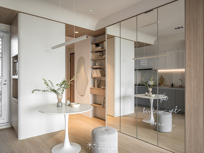 다이닝룸 옆 거울 수납장이 공간을 두 배로 넓어 보이게 하는 효과를 톡톡히 하고 있다. 수납의 기능성과 공간 확장 효과를 동시에 잡은 아이디어다.