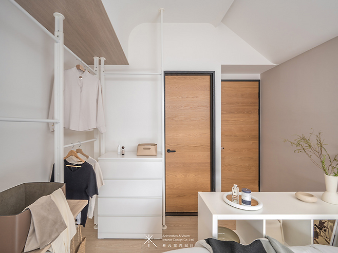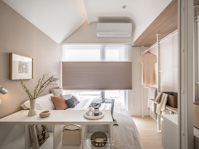 침대 발치 쪽에는 오픈형 옷걸이 공간을 만들어 수납과 디스플레이 기능을 겸하게 했다. 좁은 공간이지만 답답하지 않게 정리된 모습이 인상적이다.