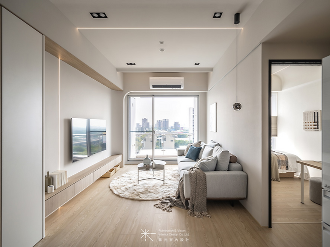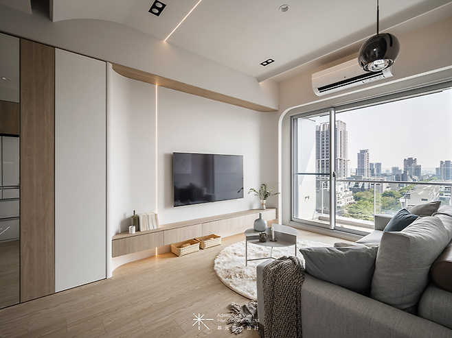 거실에 들어서면 부드러운 곡선의 천장이 시선을 사로잡는다. 직선적인 공간에 원형 요소를 더해 전체적으로 부드럽고 따뜻한 인상을 준다. TV 벽면도 모서리를 둥글게 처리해 날카로운 느낌을 완전히 제거했다.