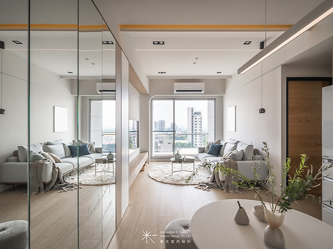 목재와 흰색, 그리고 거울면이 리듬감 있게 배치되어 있는데, 특히 상부 목재 마감과 하부 수납장이 대칭을 이루며 안정감을 준다. 곡선 천장 사이사이에 숨겨진 간접조명이 공간 전체를 부드럽게 감싸고 있어, 22평이라는 면적을 잊게 만든다.