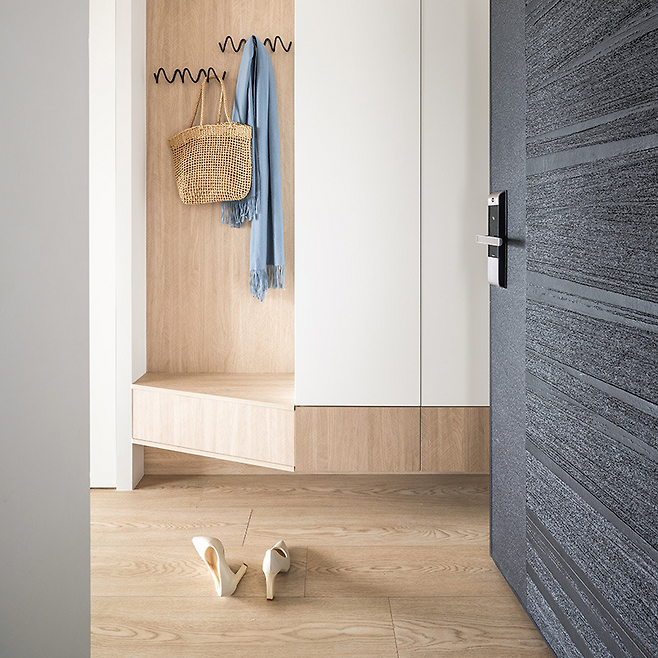 현관부터 남다른 접근이 돋보인다. 구조적으로 어쩔 수 없이 존재하는 기둥을 숨기려 하지 않고, 오히려 사선으로 배치한 신발장으로 자연스럽게 시선을 분산시켰다. 신발장 아래 숨겨진 따뜻한 조명이 집 전체의 분위기를 예고하는 듯하다.