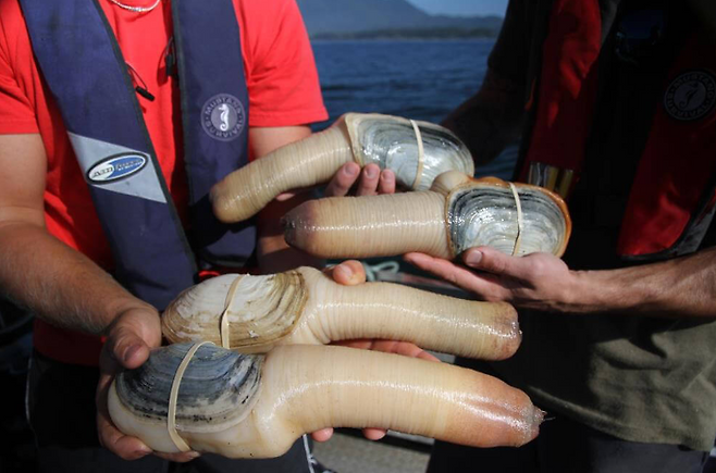 바다에서 나는 먹거리 중에 가장 괴상한 생물 중의 하나인 이 조개는 수관을 항상 외부로 노출시키고 있어 '코끼리조개', 혹은 '구이덕' 이라고 불리며 세계에서 가장 큰 천공(穿孔) 조개입니다.