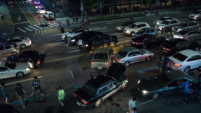 황정민의 추격을 피해 명동대로를 가로지르며 도주하는 유아인. 할리우드 영화의 뻥 뚫린 고속도로가 아닌 저녁시간 꽉 막힌 명동대로를 배경으로 추격전이 펼쳐진다.