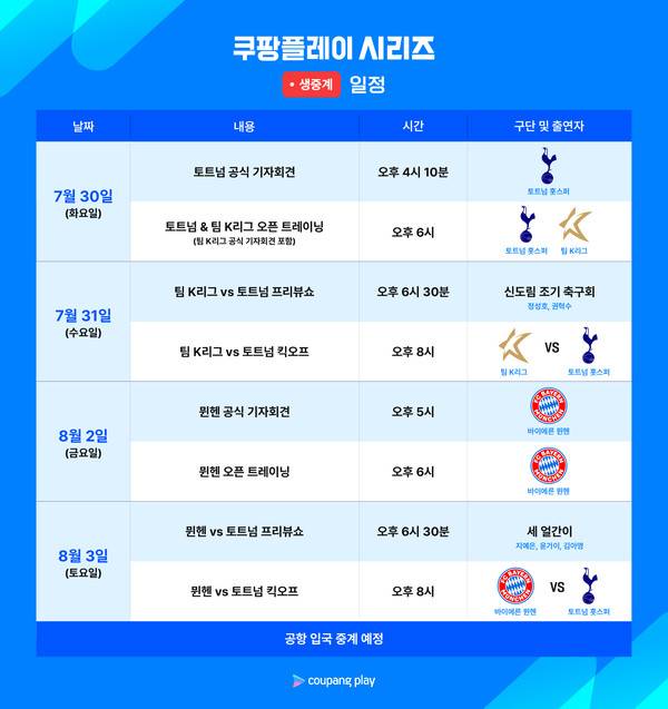쿠팡플레이 시리즈의 중계는 세계적인 선수들의 대한민국 입국 현장부터 시작한다. 토트넘 주장 손흥민을 포함해 제임스 매디슨, 데얀 쿨루세프스키 등 프리시즌에서 좋은 기량을 펼치고 있는 선수들의 입국 장면을 실시간으로 전한다. 이후 바이에른의 '괴물 수비수' 김민재를 비롯해 토마스 뮐러, 주앙 팔리냐 등 선수들의 입국 장면도 담을 예정이다.