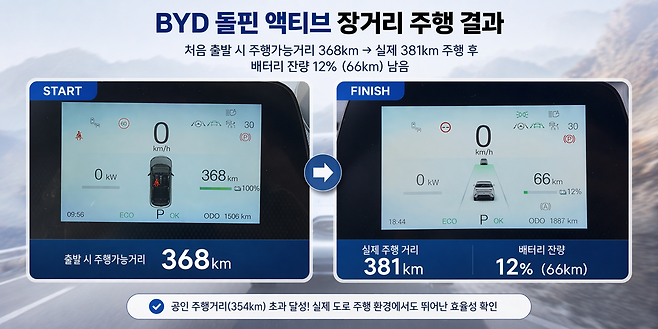 60㎾h 리튬인산철(LFP) 기반 블레이드 배터리가 장착된 BYD 돌핀 액티브는 서울과 강원도 양양 360㎞ 왕복 거리를 중간 충전 없이 주행할 수 있었다. 특히 381㎞ 이상 주행한 결과 배터리 잔량이 12%(66㎞) 남았다. 공인 주행거리(354㎞)를 웃도는 수치다.